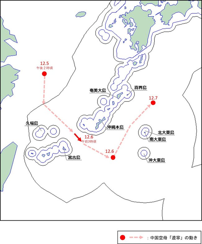 沖縄本島南方の宮古海峡を抜けた空母「遼寧」を中心とする中国艦隊は6日午後、針路を北転させ、沖縄本島と沖大東島間に広がる海域で艦載機J-15の発着艦を開始した。そこは日本の防空識別圏(ADIZ)の内側であり、直ちに航空自衛隊のF-15戦闘機がスクランブル発進した。ただし、訓練場所が日本の領土、領空に接近しているとはいえ、ここまでは中国の空母艦載機の発着艦訓練では何度も繰り返されてきた状況である。