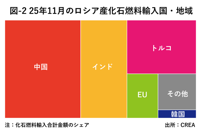 ロシアは、化石燃料の中でも販売額が大きい原油を、ロシアへの制裁に参加していない中国とインドなどに販売し(図-1)収入を維持していたが、化石燃料価格の下落もあり、25年11月のロシアの化石燃料収入は前月比1%減となり22年2月の侵攻以来最低額になった。