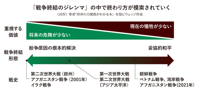 以上で見たようなロシア・ウクライナ戦争の出口をめぐる議論は、東アジアの日本にとっても他人事ではない。第二次世界大戦後の世界は、力による一方的な現状変更を認めないという主権国家体制・国連憲章体制を前提としている。ロシアを利するかたちでの停戦は、ウクライナにとってだけでなく、国際社会にとっても、それ以外の地域で力による現状変更を誘発しかねないという意味で将来の危険を残すことになる。