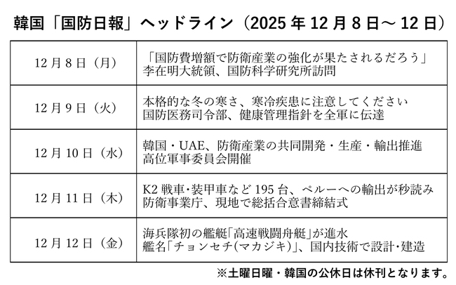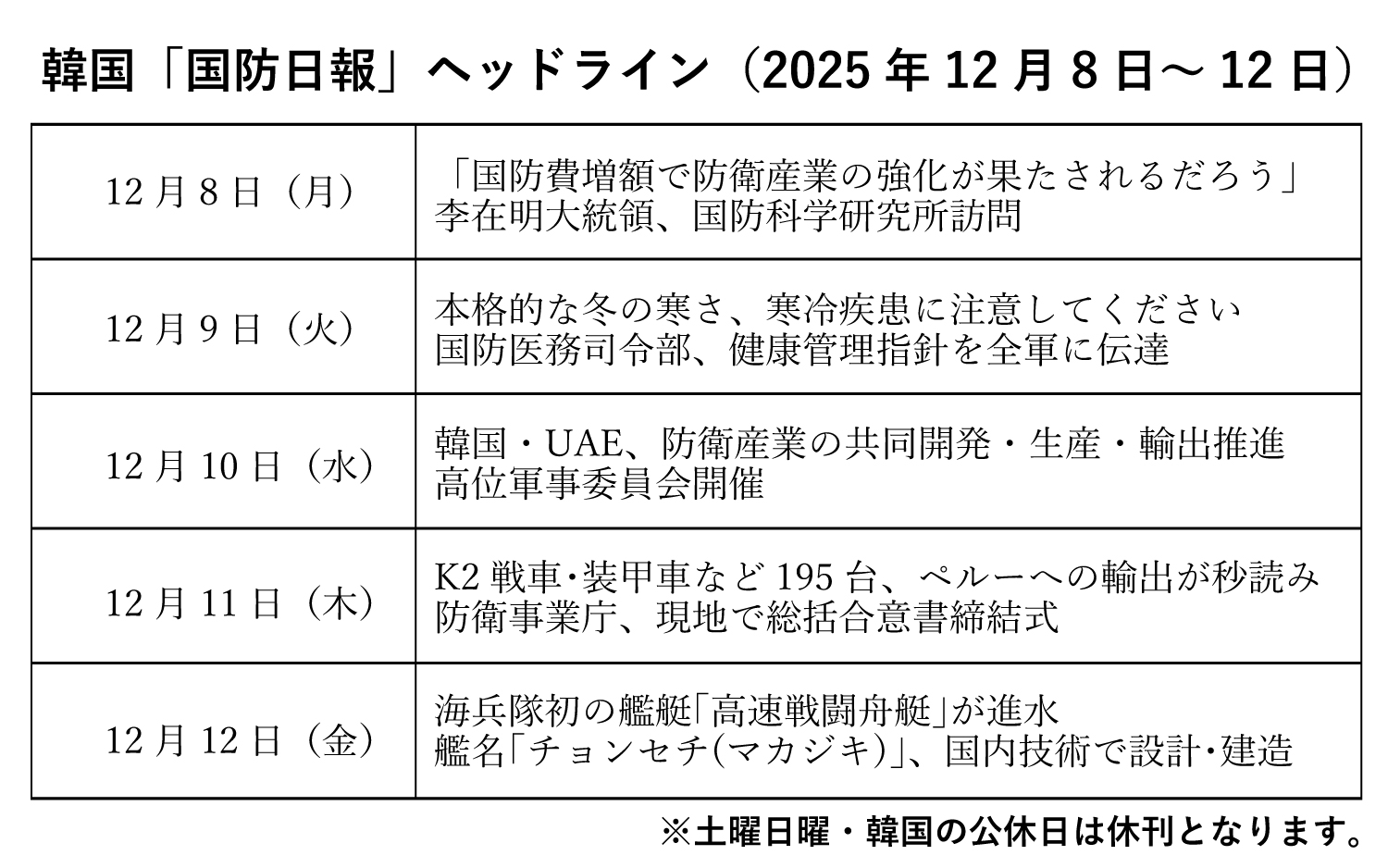 11日ヘッドラインは、韓国の主力戦車K2のペルー輸出が実現目前となり、韓国防衛産業の中南米市場進出が本格化していることを報じたもの。12月9日(ペール時間)、現代ロテムとペルー陸軍造兵廠が総括合意書を締結し、K2戦車54両とK808装輪装甲車141両を供給する内容で合意した。この契約は中南米地域への地上兵器輸出として史上最大規模であり、K2戦車の初輸出でもある。