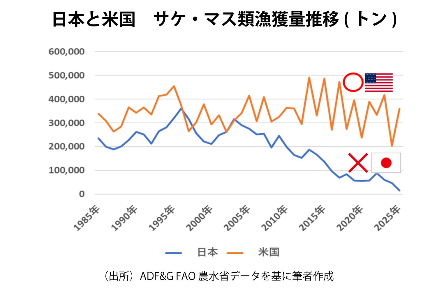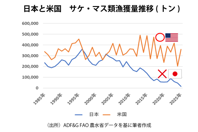 下のグラフは、日本と米国それぞれのサケ・マス類の漁獲量推移を示しています。オレンジが米国で、凸凹があるもののほぼ横ばいであるのに対して、青色の日本の数字は激減してしまっています。