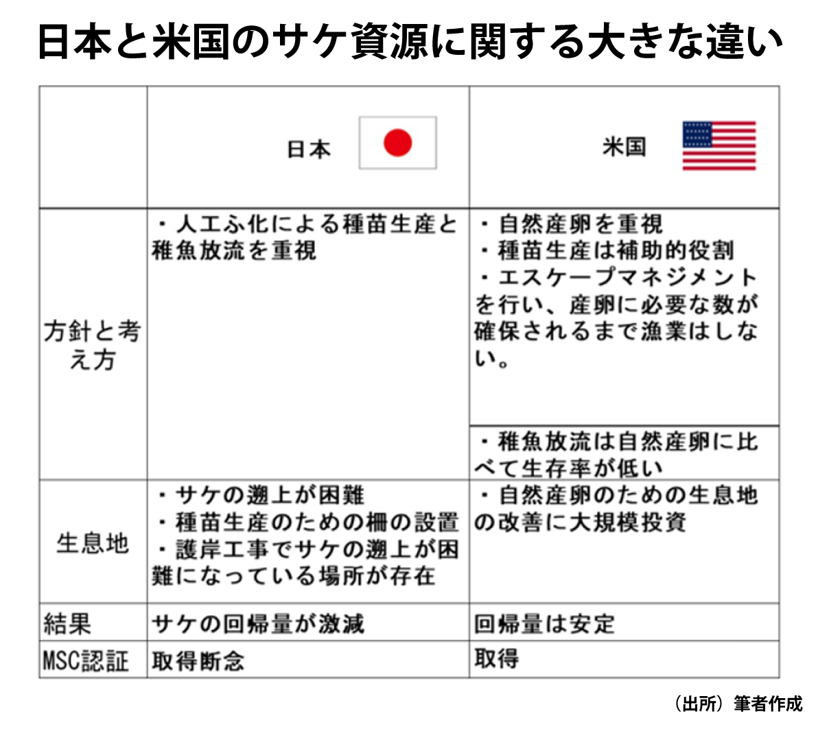 下の表はマスコミ報道で見たり聞いたりすることがない、日本と米国のサケ資源に関する考え方の違いです。筆者自身も長年にわたり誤解させられていました。