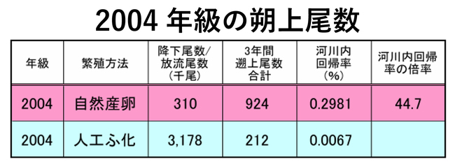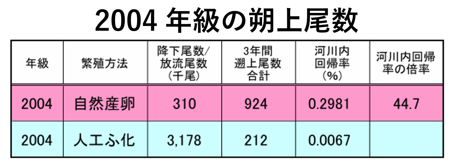 上の表がそれです。河川回帰率は、自然産卵魚が人工ふ化魚の約45倍になっていると分析しています。