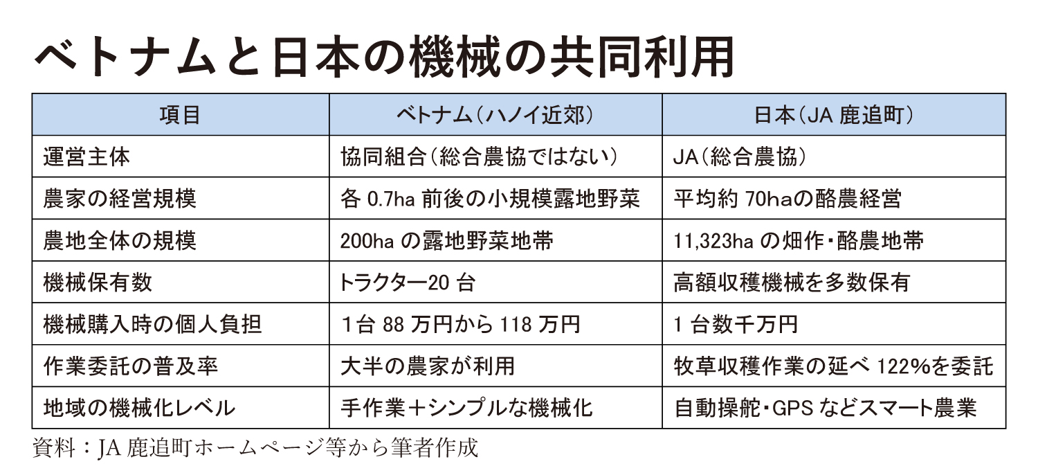 ベトナムも日本も協同組合が農家を支えるための共同利用を進め、機械所有コストを減らしている。小規模農家が大半を占めるベトナムでは、機械を個人で所有することが経済的に難しい。そのため、協同組合が機械を集中保有する仕組みが自然に発達している。日本の多くの産地、特に小規模農家が多い西日本で参考になるはずだ。