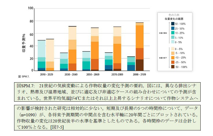 もっというと、上記の図の説明文をみても分かるように、この図にはあらゆる排出シナリオの結果が混ざっているとしている。CO2排出量もさまざま、温暖化に合わせて作物を選ぶといった適応をするかどうかもさまざま、ということである。これでは、何を読み取ってよいのかわからない。