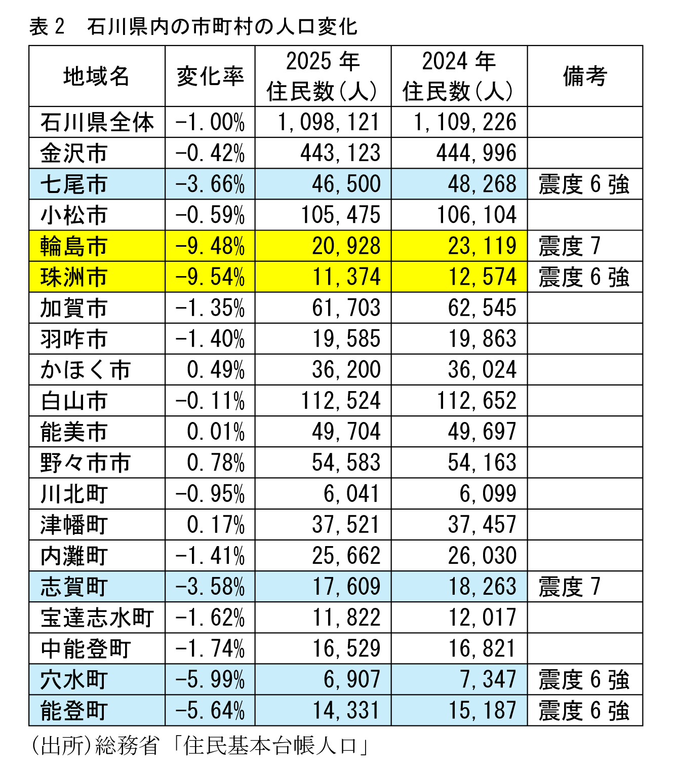 表2は図3と同じ住民基本台帳による能登半島地震が起きた24年と被災1年後の25年の間の人口変化率を示している。被害の大きかった地域で住民数の減少が大きいことがわかる。