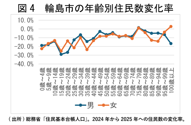 図4を見ると、おおむね30歳代以下の世代の人口変化率が大きくマイナスとなっていることがわかる。これは、親世代の流出+その子ども世代の流出のほか、15歳から19歳の進学世代の流出、20歳から24歳の就職世代の流出が起きたといえる。