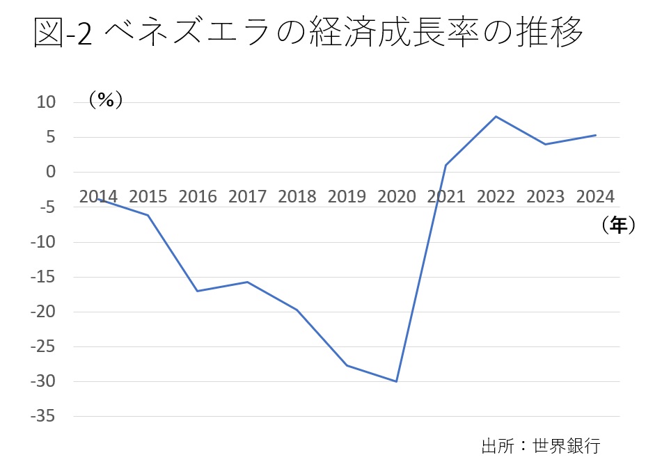 24年の経済成長率は5.3%だが、14年のマイナス3.9%から20年のマイナス30%まで7年連続でマイナス成長になっており(図-2)、国内総生産(GDP-15年価格)は13年の546億ドルから24年の167億ドルまで3分の1以下に減少した。1人当たりGDPは推定4900ドル。ネパール、カメルーンと同レベルの世界175位だ。