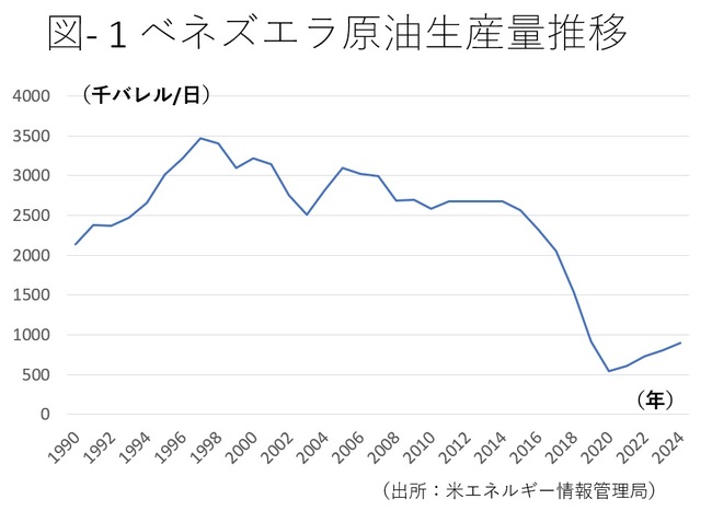 チャベス時代には、多くの技術者らがPDVSAを去り、90年代後半に日量300万バレルを超えていたベネズエラの原油生産量は、米国の制裁もあり、2010年代後半から大きく減少し始める(図-1)。