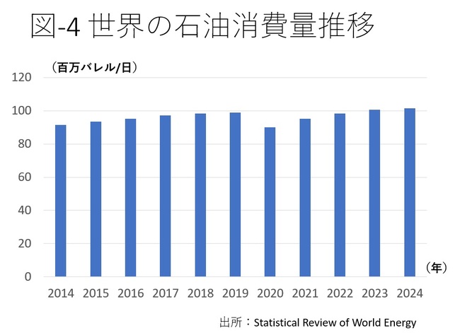 石油の国別埋蔵量は図-3の通りだ。石油の消費量はオイルショック前との比較では伸び率が緩やかになったが、途上国の経済発展もあり、毎年少しずつ増えている(図-4)。