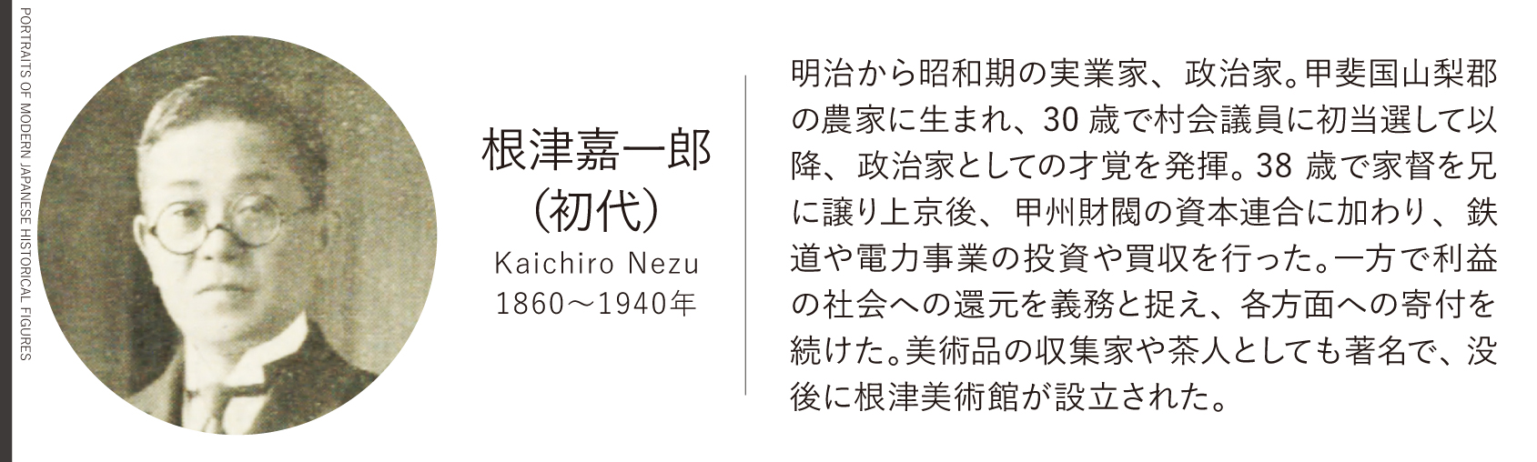 現在の山梨市で商業も営む大地主の次男に生まれた根津は、若尾との出会いによって投資家としての道を歩み始めた。その後、投資ではなく、事業による利益追求を勧める雨宮の忠告に従い、企業経営に乗り出す。傾いた会社を次々と買収してこれを立て直し、次第に実業界での地位を高めた根津は、1905(明治38)年に東武鉄道の社長に就任する。