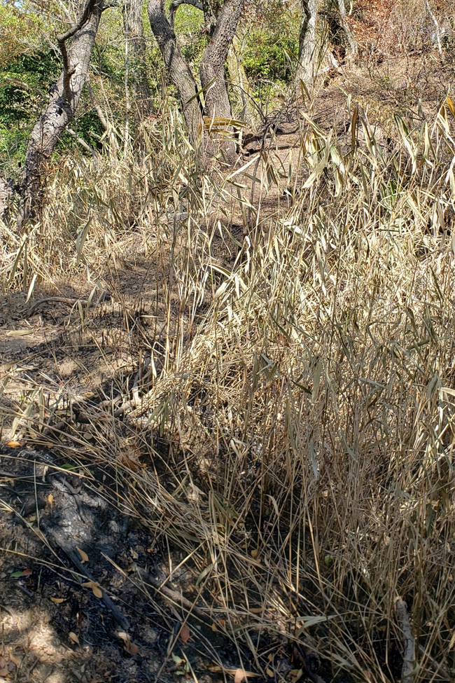 鎮火数日後、現場を歩いてみた。幸い燃えた面積はしれていたが、急斜面を炎が一気に駆け上がった様子が焼け跡からわかった。そして火元は、登山客が休憩したであろう場所にある枯れ草の小さな一点だった。あきらかにタバコの不始末を思わせる。