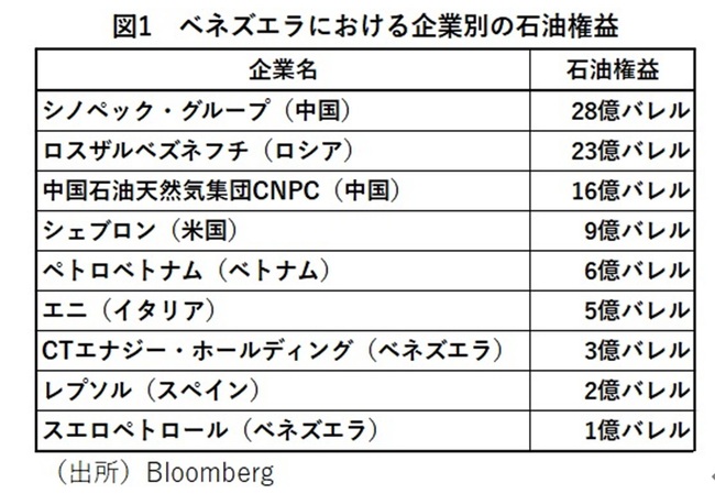 現在、ベネズエラの石油埋蔵量に対する権益(entitlement)を主に保有している外国企業は、主に中国とロシアの国営企業である。各社が契約に基づいて直接販売・収益化可能な石油権益を見ると、中国のシノペック・グループが最大の28億バレルを保有しており、ロシアのロスザルベジネフチが23億バレル、中国の中国石油天然気集団(CNPC)が16億バレルで続く(図1)。