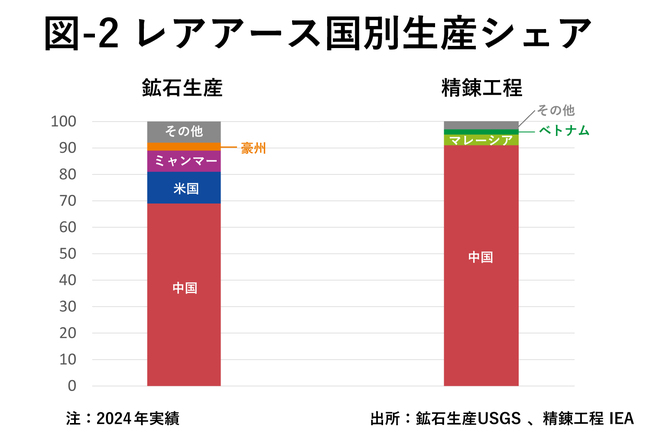 図-2が現在のREEの生産、精錬過程の国別シェアを示している。鉱石生産段階では中国のシェアは69%だが、精錬段階では91%に達している。米国も精錬したREEの24年の自給率は2割しかない。