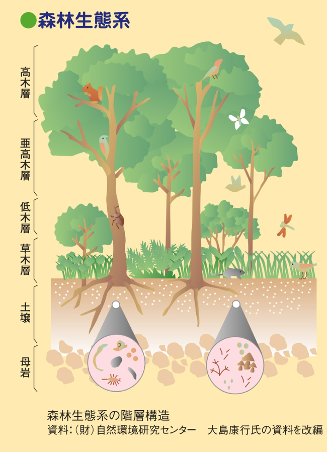 森林を構成するのは樹木だけでなく、多様な動植物やそれらの生活を支える土壌、基岩、水系に及び、それらが相互に作用して支え合う環境が森林生態系である。森林に生きるすべての生物とそれらを支える基盤を含めて森林の構成要素なのである。