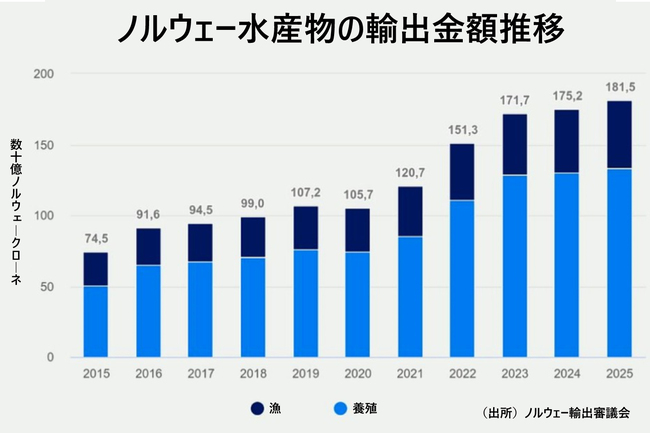 ロシアへはゼロでも、ノルウェーの水産物輸出は世界第2位(1位は中国)で毎年過去最高を更新し続けており絶好調です(上グラフ 紺が漁業で青が養殖)。25年は、日本(24年)の約8倍の約2兆8000億円(1815億ノルウェークローネ)です。