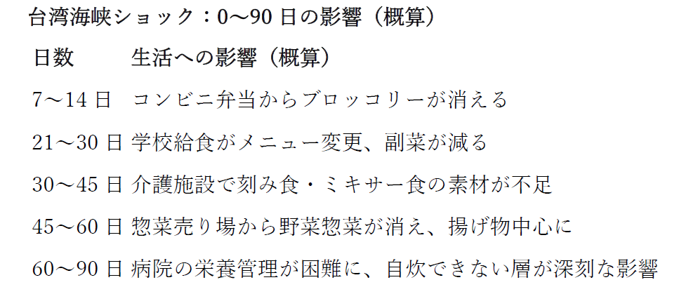 冷凍野菜の在庫は、外食・中食で7〜14日しか持たない。台湾海峡が止まって10日もすれば、コンビニ弁当からブロッコリーが消える。