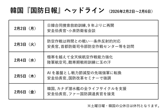 注目されるのは、99年に始まり17年を最後に途絶えていた日韓海上捜索救助訓練(SAREX)の約9年ぶりの再開だ。また、AI・無人機・宇宙など先端技術分野での協力を模索する方針でも一致した。このほか、韓国空軍「ブラックイーグルス」が沖縄の航空自衛隊那覇基地に初めて立ち寄り、「ブルーインパルス」と交流したことを双方が歓迎した。