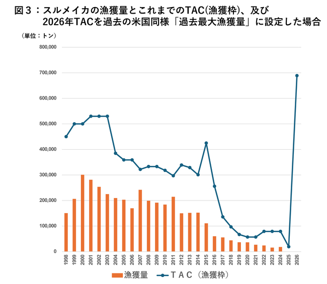 過去採用されていた2万2195トン(投棄分を含めると2万4000トン)というTACは、米国のこの海域での過去最大漁獲量に基づいている。この数字に固定していたのは、資源量がよくわかっていないものの、資源分布域のごく一部でしか操業が行われていないこと等から、漁獲の程度は軽微(lightly exploited)との判断による(MAFMC 2018, p. 7)。もしスルメイカを過去米国がカナダマツイカの管理で行っていたのと同様に、過去の最大漁獲量で固定すると、以下の図のようになる。
