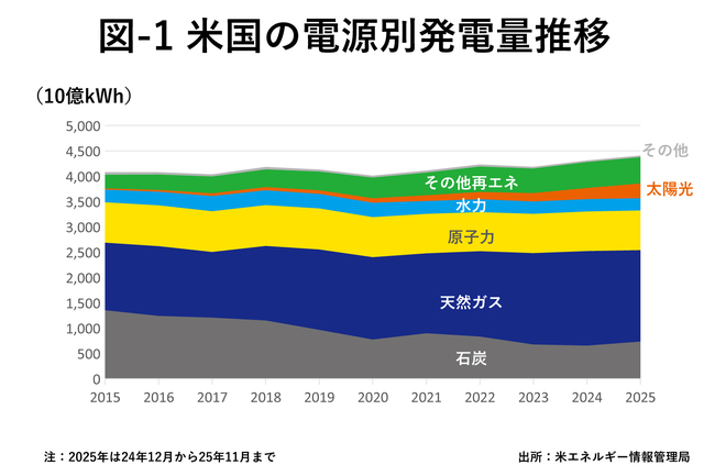 もうひとつのもっと大きな要因は、米国のエネルギーと電力供給を取り巻く状況の変化だ。10年以上成長がみられなかった米国の電力消費量は、生成AIを支えるデータセンターの電力消費増により増加に転じた。将来の電力不足も懸念される状況になり、使える発電設備は何でも使う時代になってきた。