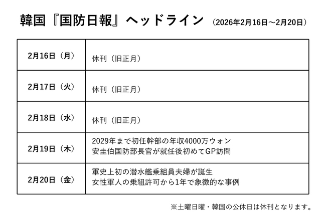 国防日報は韓国の旧正月にあわせて3日間休刊した。残る紙面では海軍関係のニュースが大きく扱われ、海軍トップの参謀総長が非常戒厳に関与していたとして職務停止になったこと、潜水艦乗組員同士の夫婦が初めて誕生したことが報じられた。