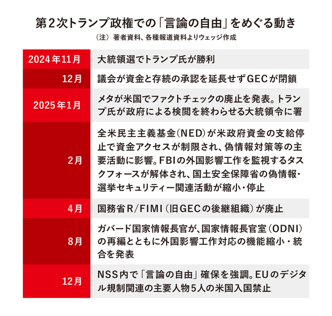 バイデン政権時代に、国務省傘下で外国からの偽情報対処の旗振り役であったグローバル・エンゲージメント・センター(GEC)に対し、共和党が活動継続のための再承認案を下院で阻止した経緯もある。第2次トランプ政権発足後から、GECとその後継組織をはじめ、米連邦捜査局(FBI)や国土安全保障省内の関連組織などが解体・制限され、外国による偽情報や情報操作を監視・分析・対処する実行力が事実上失われる事態へと発展した。