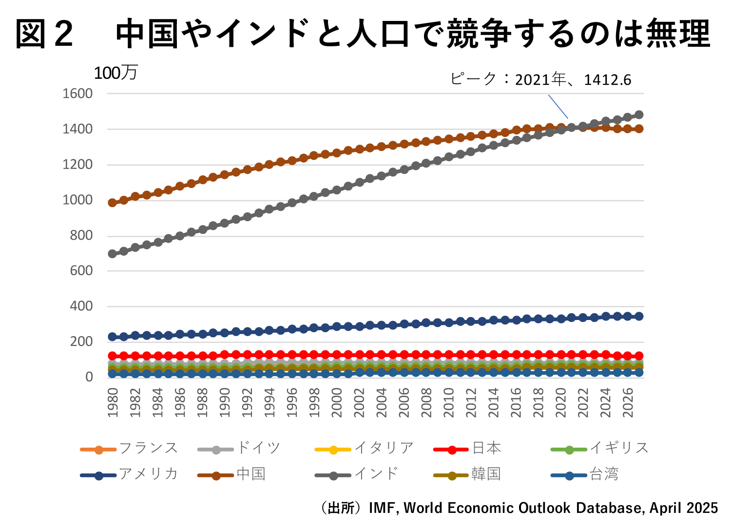図2で日本の人口を中国やインド、アメリカと比較すると、当然のことだが、日本がこれらの国と人口で競争するのは無理だと分かる。それはアメリカですら同じだろう。ただ、中国の人口はすでに減少に向かっている。