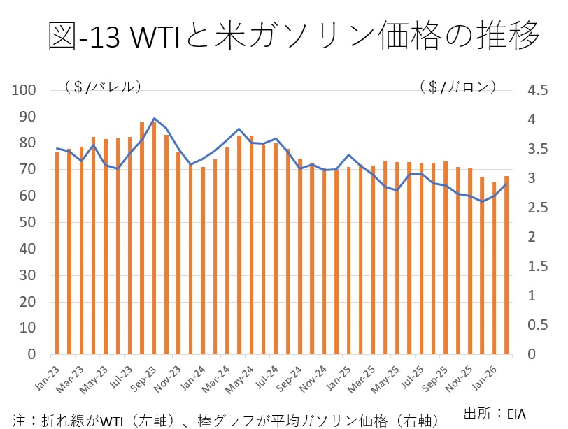 米国は、石油、天然ガス、石炭全て自給できるエネルギー大国だが、米国の原油価格WTIは、ブレントなど世界の原油価格にリンクしている(図-12)。米国のガソリン価格は、当然だがWTIの原油価格に影響される(図-13)。