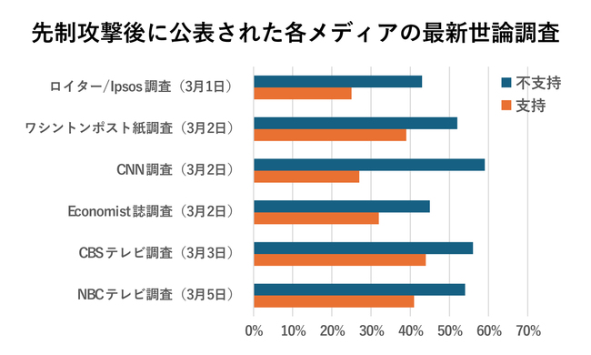 11月中間選挙を控えトランプ政権にとって当面の最大関心事は、今回のイラン戦争に対する国民の反応だが、先制攻撃後に公表された各メディアの最新世論調査はいずれも以下の通り、「不支持」が「支持」を大きく上回っている。