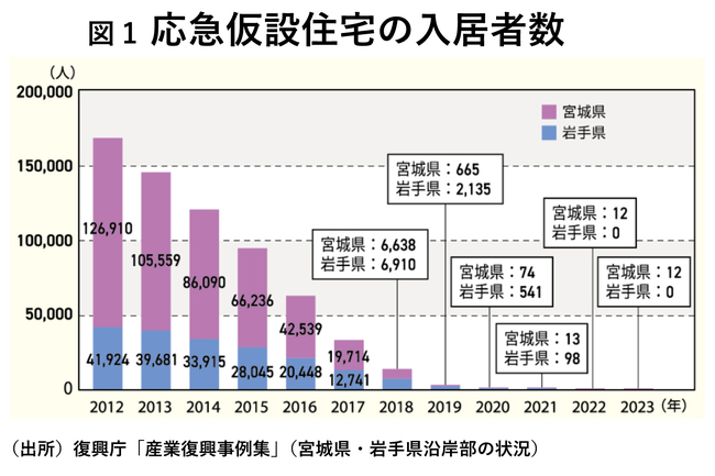 このことは、岩手、宮城のこの2地域に関して、復興局は一定の役割を終えたという認識があるといえるであろう。例えば、図1に示す通り岩手、宮城については、当初16万人を超えた応急仮設住宅の入居者数は減少し、岩手県は21年3月末で応急仮設住宅の提供は終了している。