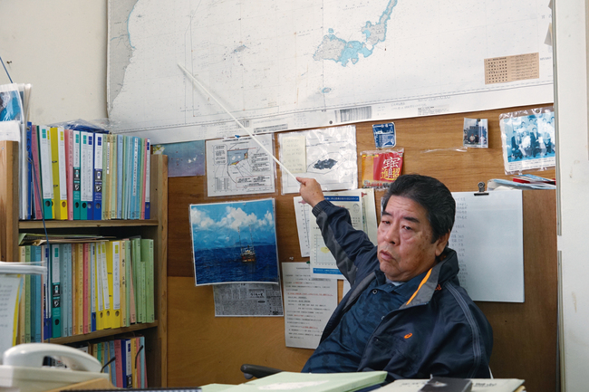 与那国島が誇るカジキ漁について説明してくれたのは、与那国町漁業協同組合組合長の嵩西茂則さんだ。嵩西さんが座る漁協事務所の机の背後には、「日台民間漁業取り決め関係水域」の地図が貼られていた。嵩西さんは地図を指示棒でなぞりながら、台湾有事をめぐる昨今の動きについて、本音を語ってくれた。