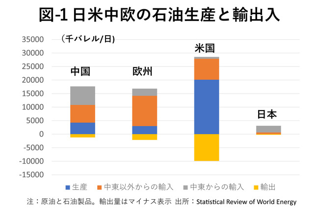 米国、欧州(欧州連合外の英国なども含む)、中国、日本の生産量、原油と石油製品の輸入量、その内中東からの輸入量を図-1に示した。石油製品の輸出量はマイナス表示だ。