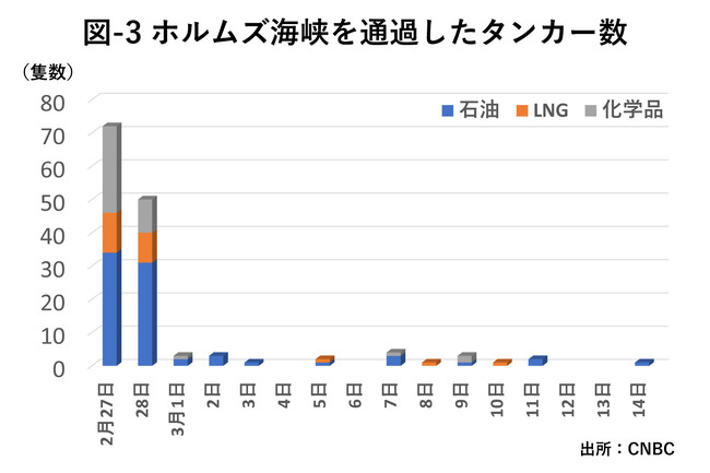 3月1日からホルムズ海峡を通過する船舶は大きく減少した。3月17日までに通過した船舶は105隻。図-3がその内14日までにホルムズ海峡を通過した21隻のタンカーの内訳を示している。