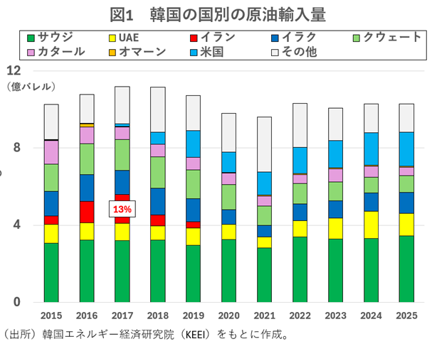 韓国にとって、UAEは主要な原油調達先である。韓国は日本と同様、エネルギー源の大半を海外から輸入している。韓国エネルギー経済研究院(KEEI)の統計によれば、25年の国別原油輸入量では、サウジアラビア(総輸入量の33%)に次いで、UAEが第2位(11%)となった。