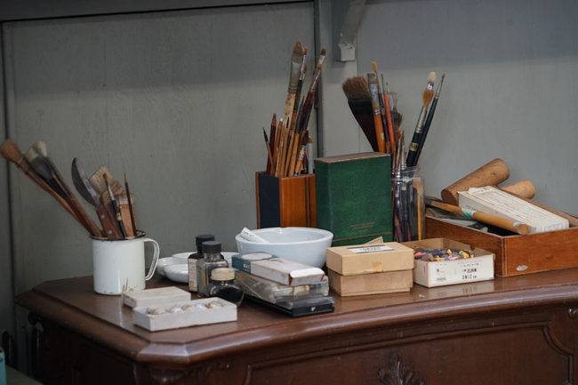 見どころは、所狭しと置かれた家具ほかの品々だろう。バイオリンやリュート、シンプルな木製机に乗せられたガラスコンポートや珈琲ミルなど、みな小磯の静物画で見覚えあるモチーフばかりで、他にもモデルが使ったパラソルや帽子、椅子などがそのまま残されている。いまにも画家がそこに現れて、絵筆を取りそうな空気感を醸し出す。机には絵の具が山のように盛り上がったパレットが。小磯はパレットを洗わず、そのまま絵の具を上に乗せてゆくのが癖だった。