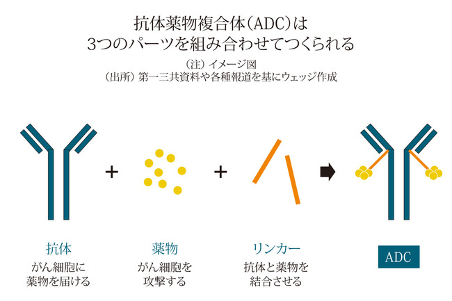 アンサンブル創薬が新薬開発に二つの新潮流を生んだ。第一は特許切れの薬効成分(モジュール)の復活だ。第一三共がADCのエンハーツで利用した薬剤は旧第一製薬が創製した「イリノテカン」という有効成分の誘導体(一部を変化させた物質)で、それを組み合わせることで、特許切れの薬剤の特許を新たに獲得できることもアンサンブル創薬の魅力なのだ。