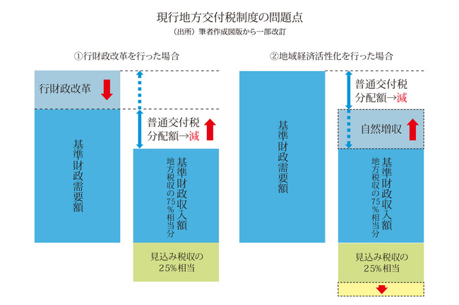 つまり、基準財政収入額との差額が縮まり、交付税の分配額が目減りしてしまうのだ。見方を変えれば、地方自治体が自主的に行財政改革を進めるインセンティブを削いでしまうものと言っても過言ではない。