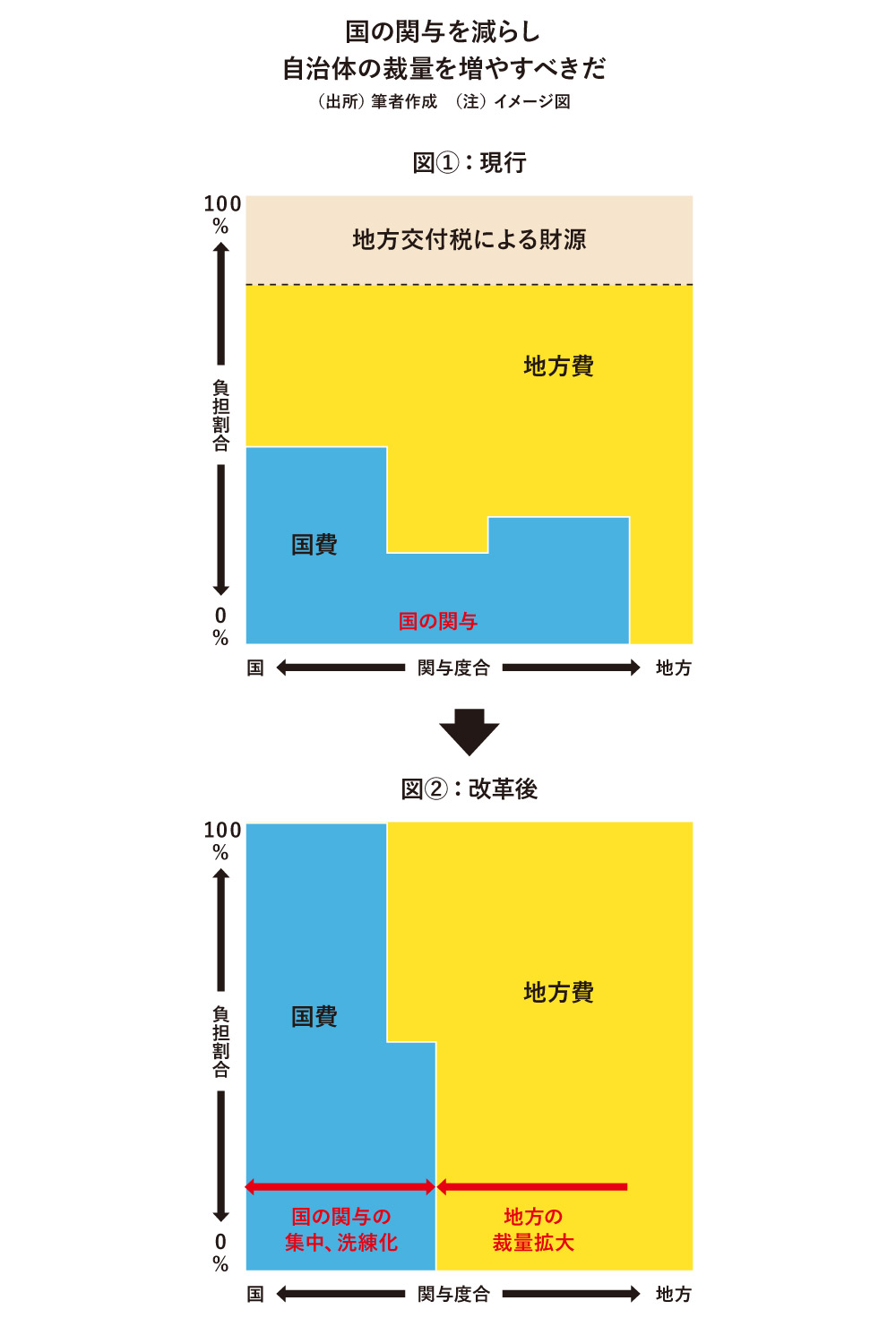 図①では、現行の国の関与の仕方のイメージを表している。横軸に、左側から国が強く関与すべき行政分野で、右側に行くほど地方自治体が自主的に判断して実施すべき行政分野として並べるとする。縦軸は、行政サービスを提供するのに必要な財源をどの財源で何割ほど賄っているかを表す。