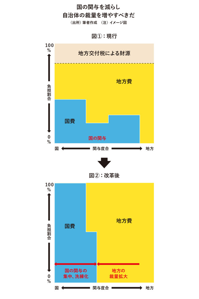 もちろん、最低限の行政水準を超えて行政サービスを提供することは認められる。ただし、その最低限に必要な経費は国が財源を全額保障した上で、それを上回る水準の行政サービスや独自に実施する場合には、地方自治体が自ら得た税収などによって、国に依存せずに行うという仕組みにしていくことが望ましい。