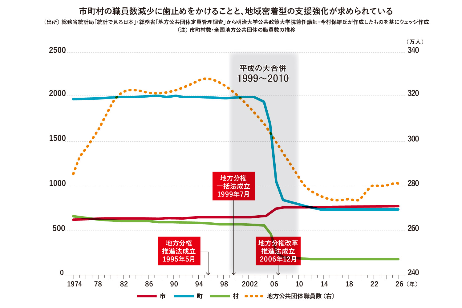 全国知事会は25年12月、市町村職員の減少も踏まえ、「どの市町村でやっても同じ業務は、共通化できれば都道府県が引き受けることもできる」という考え方を発表した。しかし、これだけで根本解決とはならない。各市町村にはそれぞれの特色があり、「どの市町村でやっても同じ業務」ではない仕事も多い。浅沼さんや山口さんの例を都道府県が個別に支援することはできない。地域に密着する市町村だからできる。