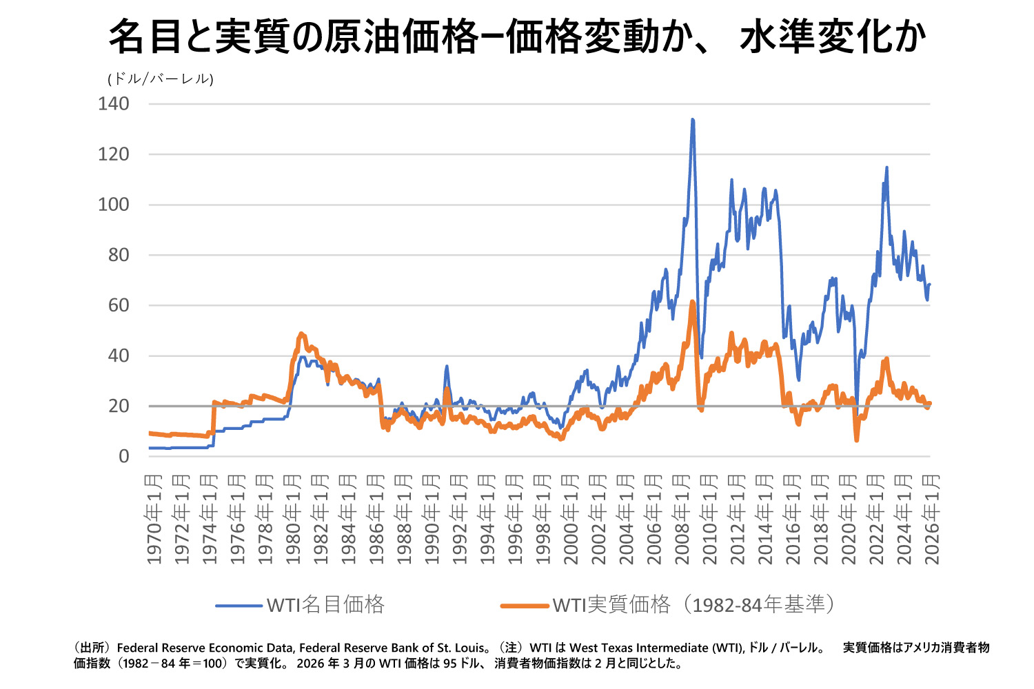 03年のイラク戦争時には上昇したが09年には下落した。10年からのアラブの春とその後の混乱で再び上昇したが、16年には元の水準に戻ったように見える。22年以降はロシアのウクライナ侵攻とともに上昇したがトランプ大統領のイランへの攻撃があるまで、再び実質20ドルに向けて下落していた。