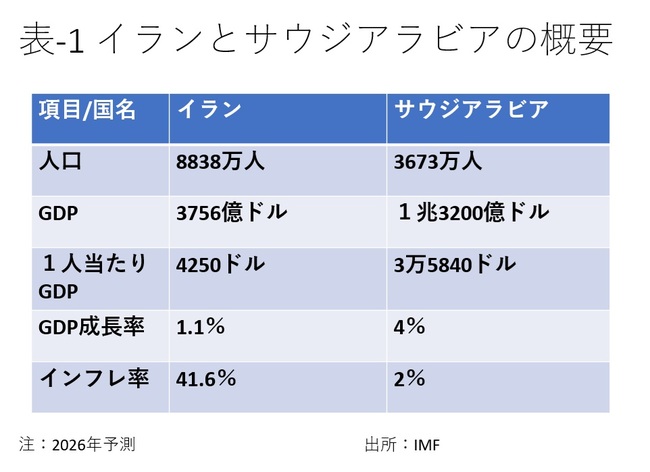 同じく中東の大国サウジアラビアと比較すれば、イラン経済の低迷ははっきり分かる(表-1)。予測の26年の数値は戦争によりさらに悪化する。