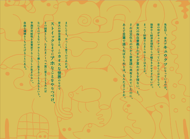 本書は、この「アホなことをせぇ」を起点にはじまる「何か」を「京大的教養」と名づけて探求する試みです。導き手は、「京大的アホ」の重要性を世の中に広めるべく「京大変人講座」をはじめた、京都大学名誉教授の酒井敏先生。そして、『京大的文化事典 自由とカオスの生態系』(フィルムアート社)で、京大の学生文化と大学自治の関係を論じたわたしは、酒井先生と読者のみなさんの仲立ちを務めることになりました。