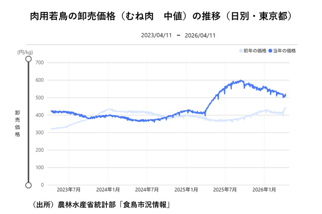 国産鶏肉に対する潜在的な需要に加え、円安の進行に伴う輸入鶏肉の価格上昇が背景にあるとされる。SNSなどで、価格高騰の理由に高病原性鳥インフルエンザの影響を挙げる向きもあるが、肉用鶏での国内発生は今シーズンの場合、全23事例(約552万羽)のうち5事例(約33.7万羽)に止まり、その影響は年間7億羽を超える全国出荷羽数から見て極めて軽微といえる。