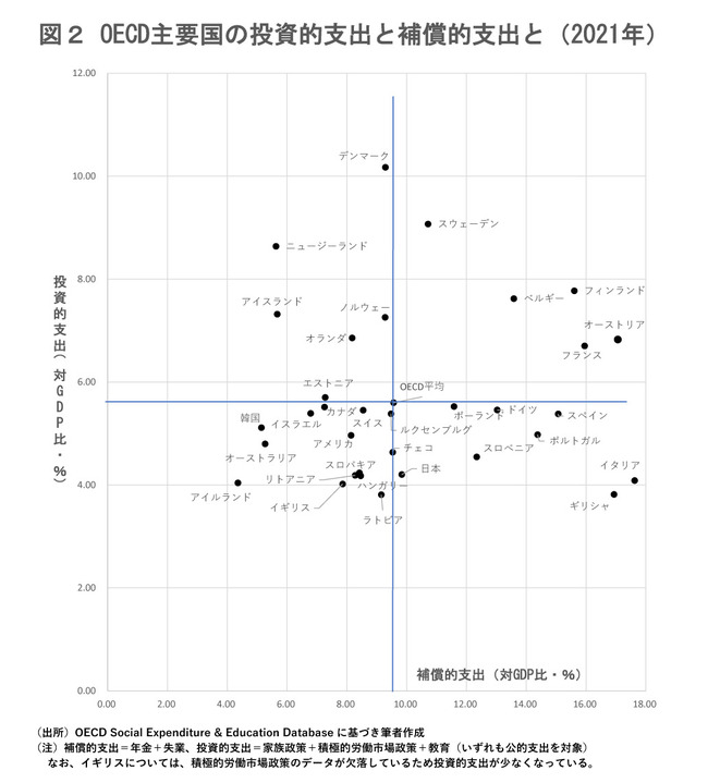 近年、経済発展のため人的投資が重視されており、特に家族政策・積極的労働市場政策・教育である。これらの支出と補償的な支出である年金・失業のバランスを比較する(図2)。