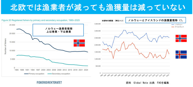 ノルウェーをはじめとする漁業を成長産業にしている国々も漁業者の数は減っていますが、その分は残りの漁船と漁業者が漁獲するので、魚種ごとに凸凹はあっても全体として漁獲量は横ばいです。世界と日本を比較すれば一目でわかることです。