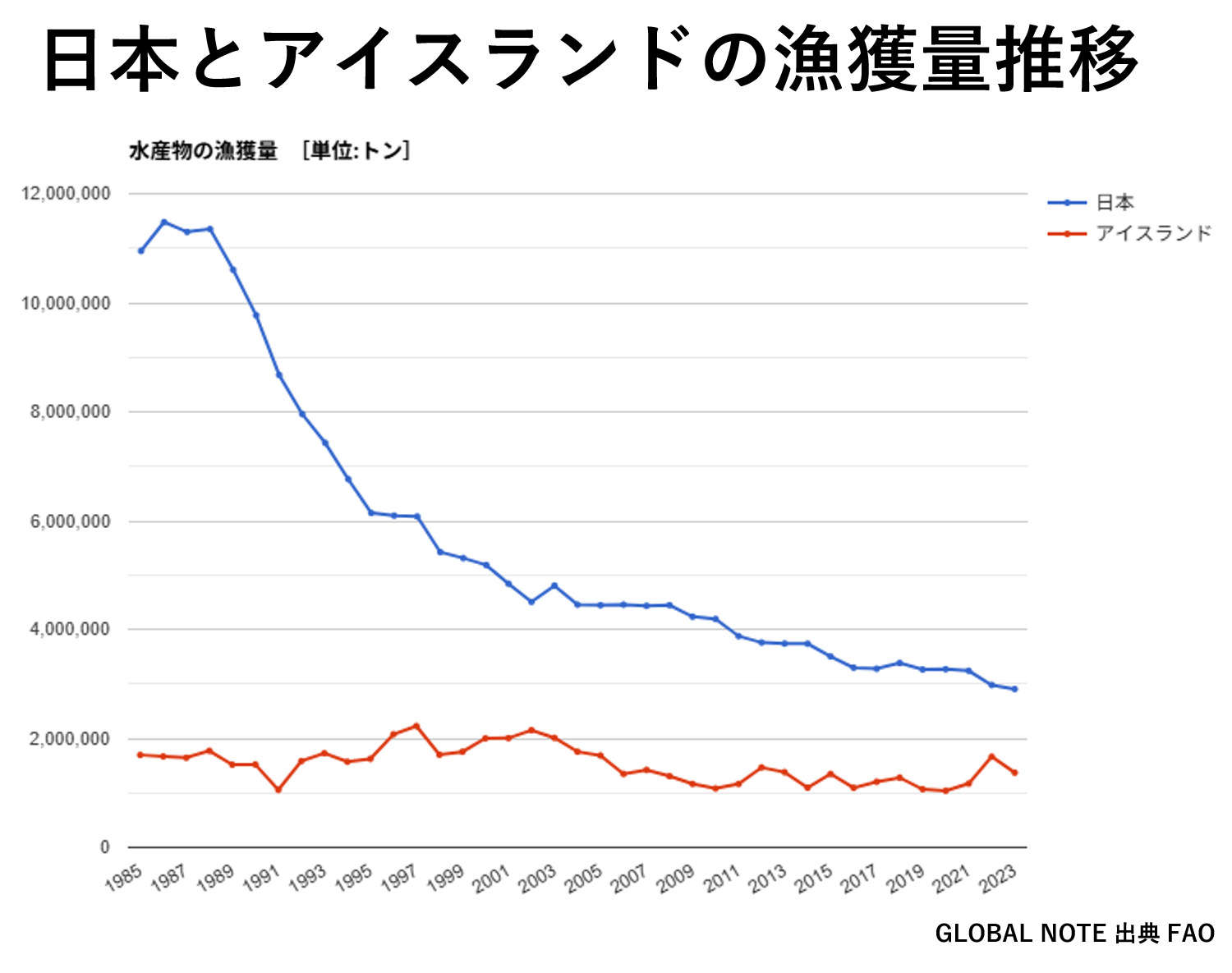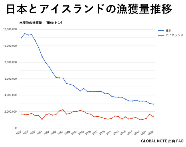 下のグラフは青が日本・赤がアイスランドの漁獲量推移です。日本の漁獲量の減少は止まりませんが、アイスランドの漁獲量は横ばいです。科学的根拠に基づく資源管理が行われていると、このアイスランドの推移のように横ばいになります。