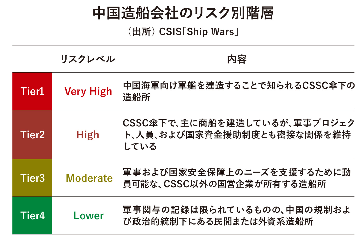 この中では中国造船所を4つのリスクレベルに応じて分類している。