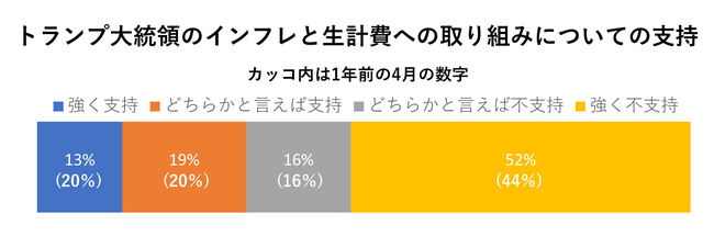 トランプ大統領の職務執行状態についての支持は、次の通りだ。カッコ内は1年前の4月の数字だ。