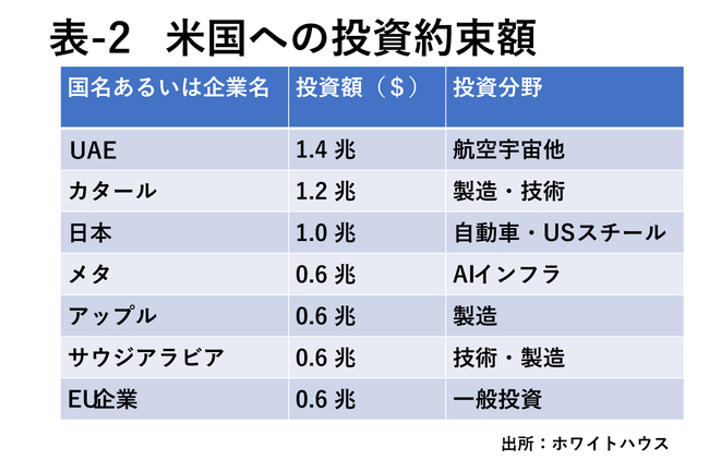 ホワイトハウスの資料によると、米国への最大の投資国は、UAE。投資額は1兆4000億ドル(220兆円)だ。投資先は、航空宇宙、エネルギーなどだ。第2位はカタール1兆2000億ドル(190兆円)。サウジアラビアも6000億ドル(95兆円)だ。湾岸諸国の米国への貢献は大きい。ちなみに日本の投資額も1兆ドルとされている。表-2が上位の投資国、企業を示している。